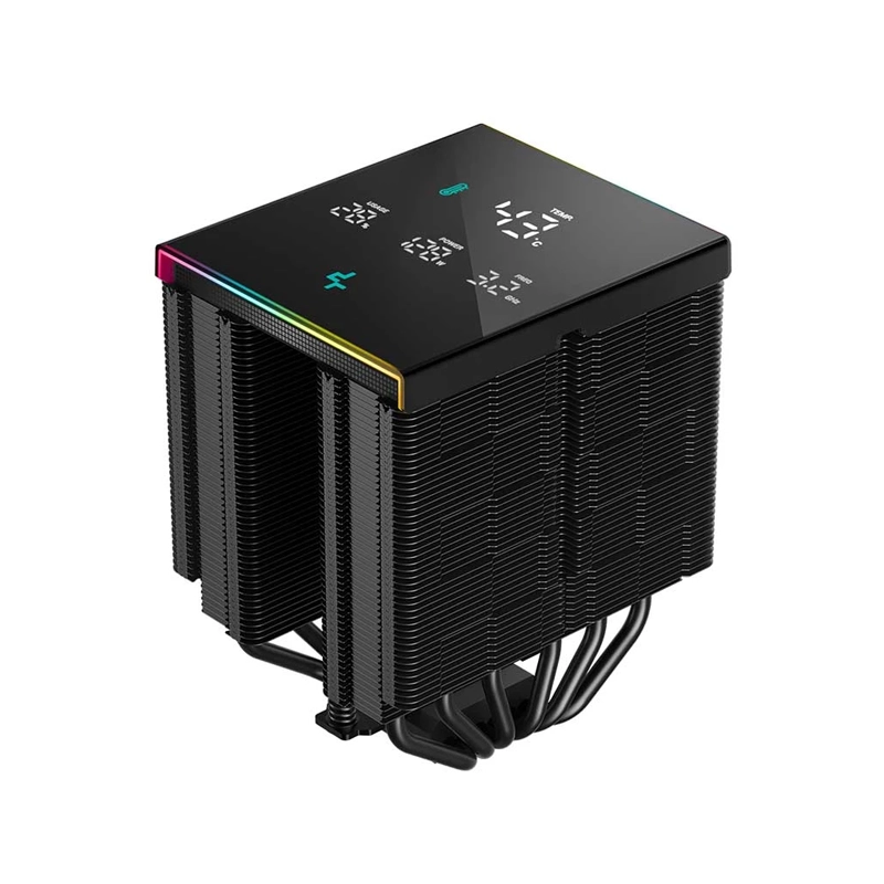 یکی از جذابترین ویژگیهای خنککننده بادی DeepCool AK620 DIGITAL PRO، نمایشگر دیجیتال بالای هیتسینک است که اطلاعات دمای CPU را بهصورت لحظهای نمایش میدهد. همچنین نورپردازی ARGB از طریق کانکتور 3 پین و اتصال USB 2.0 قابل کنترل است.